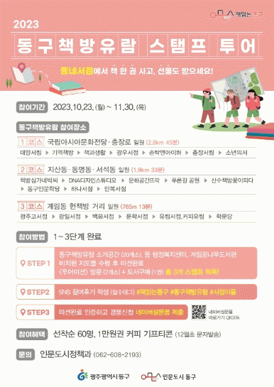 참여 방법은 시민, 관광객 누구나 ‘동구 책방 유람’에 소개된 20곳 중 2곳을 방문해 스탬프를 받고 도서 1권을 구매한 후 이를 SNS에 게시하고 네이버 폼에서 설문 작성 후 제출하면 된다.