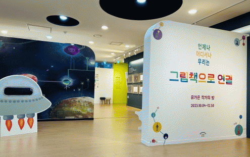 안으로 들어오면 그림책 원화와 아트프린트, 판화 작품이 전시돼 있고, 액자 주변엔 책 속 캐릭터들이 귀엽게 자리하고 있다. 대형 TV 화면에는 '행성-P' 영상물이 전시되고 있어 작품을 이해하는 데 도움을 받을 수 있다.