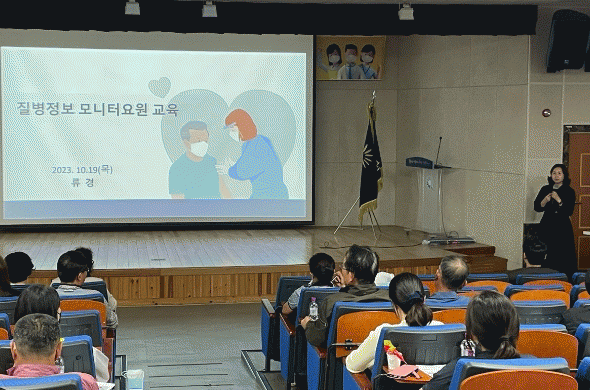 이번 교육은 서영대학교 간호학과 류경 교수를 초청해 감염병의 종류. 증상 및 감염 경로, 질병정보 모니터 요원의 주요 업무와 감염병 발생 시 신고 체계 중심으로 진행됐다.