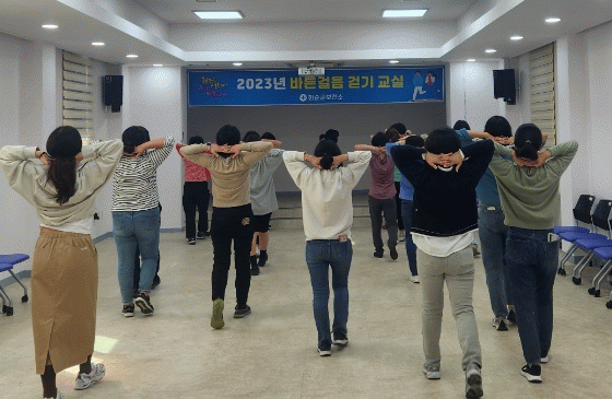 ‘바른걸음 걷기 교실’에서는 전문 걷기 강사 지도하에 걸음 시범(워킹 테스트)과 넓적다리관절(고관절) 및 체력 강화 운동 등으로 지역주민의 기초체력을 높였다.