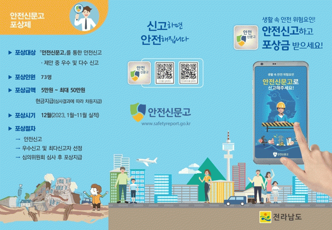 오미경 전남도 사회재난과장은 “안전신문고는 도민 모두가 안전지킴이로서 피해가 예상되는 곳곳의 위험 요인을 실시간으로 신고해 사고 없는 안전한 전남 만들기에 기여하면서 포상금까지 받을 수 있는 제도”라며 “안전에 대한 경각심과 재난을 미연에 방지하는 분위기 조성에 관심과 동참 바란다”고 당부했다.