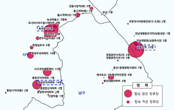 이를 위해 광주시는 지난 4월 한 달간 시내버스 장애인 탑승객 현황 데이터에서 장애인이 자주 이용하는 일반버스 상위 노선과 버스번호를 추출했다. 장애인 탑승데이터와 차량번호별 저상버스 여부를 매칭해 시간대별, 정류장별 장애인 탑승객을 분석하고, 이를 시각화한 것이다.