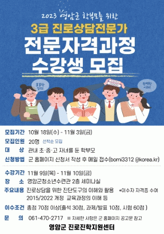 영암군진로진학지원센터가 11월 9~10일 초·중·고 자녀를 둔 학부모가 참여할 수 있는 ‘3급 진로상담전문가 자격증’ 취득 과정을 개설한다.