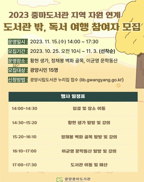 행사 참여를 원하는 시민은 오는 25일 오전 10시부터 광양시립도서관 누리집(홈페이지)과 전화를 통해 선착순 신청 가능하며, 모집대상은 성인 15명이다.