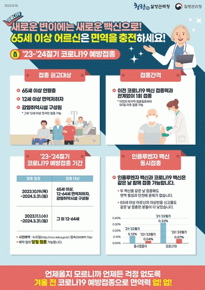 이번 절기 접종은 현재 유행하는 변이에 맞춰 개발된 XBB를 기반으로 한 화이자, 모더나 백신이 활용되며, 과거 접종력과 상관없이 마지막 접종 일부터 최소 3개월(90일) 이후 1회 접종으로 완료되며, 관내 24개 접종 기관(보건기관 17개소, 지정 의료기관 7개소)에서 접종할 수 있다.