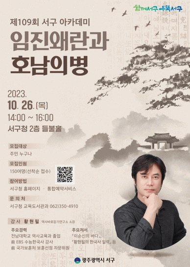 그는 이번 강연에서 7년 전쟁이라는 위기에서 나라를 구한 충무공 이순신과 전쟁 앞에서 국가와 민초를 생각하며 봉기한 호남의병을 통해 현대를 살아가는 우리의 의무에 대해 이야기할 예정이다. 이날 강연은 관심 있는 주민 누구나 참여 가능하다.
