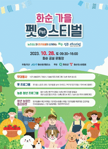 화순 청년 회의소 주관으로 오전 9시 30분에서 오후 16시까지 예정된 ‘화순 가을 펫스티벌’에서는 반려동물에 대한 인식 개선을 위한 프로그램과 화순 농산물 전시·홍보를 위한 농산물 벼룩시장(플리마켓)가 운영된다.