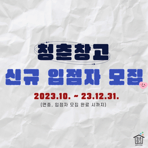 청춘창고는 청년들의 많은 관심으로 입점률 100%를 유지해 왔으며 1층(식.음료) 1점포와, 2층(공예.체험 등) 1점포를 신규 모집하고 있다.