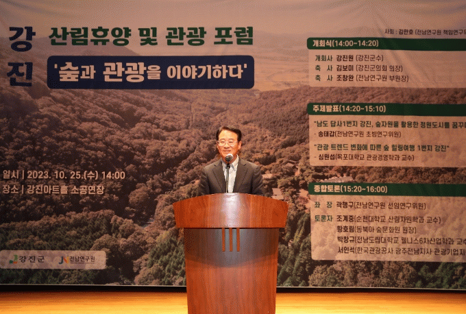 포럼은 전남연구원 송태갑 연구위원의 ‘남도답사 1번지 강진, 숲자원을 활용한 정원도시를 꿈꾸다’ 와 목포대학교 송태갑 교수의 ‘관광 트렌드 변화에 따른 숲 힐링 여행 1번지 강진’에 대한 주제 발표로 진행됐다.
