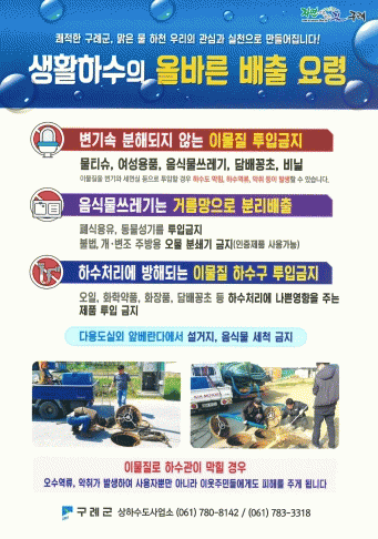 구례군은 최근 가정에서 발생하는 일부 하수에 기계설비 고장을 일으키는 이물질이 섞여 있어 시설 유지관리에 많은 어려움을 겪고 있다고 밝혔다.