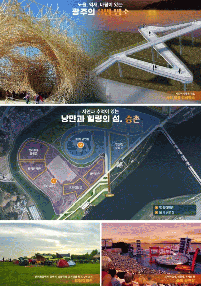 승촌섬은 자연과 추억이 가득한 ‘낭만과 힐링의 섬’으로 재탄생한다. 이곳에는 반려동물 캠핑장, 글램핑장, 오토캠핑장 등 170면의 힐링캠핑장을 조성, ‘캠핑 메카’로 만든다. 이곳에는 강변가요제, 영화제, 콘서트 등 물 위에서 펼쳐지는 공연 극장인 ‘빛고을 수상 공연장’도 조성한다.