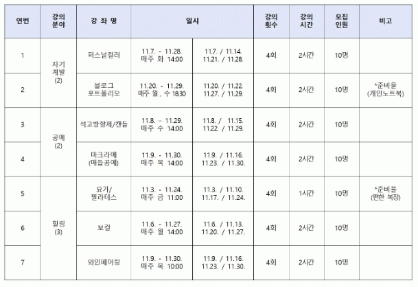 이현주 청년일자리과장은 “청년들의 수요가 많은 강좌를 엄선했다”며 “광양 청년들이 풍성한 문화생활을 즐기는 11월이 되길 바란다“고 말했다.