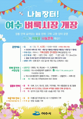이번 벼룩시장은 캘리그라피, 전통놀이 체험, 재활용 팔찌 만들기 등 다채로운 체험행사도 마련되며, 여수사랑상품권 활성화를 위한 가맹점 등록 홍보 부스도 운영된다.