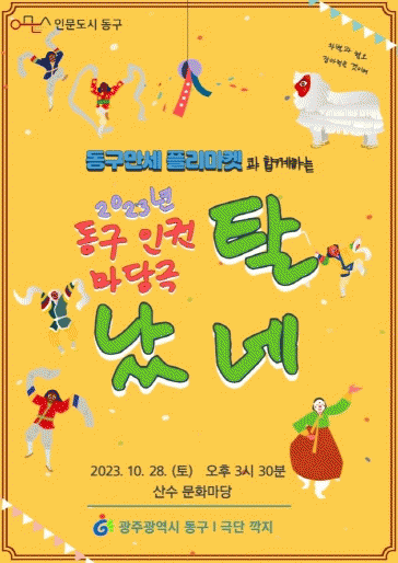 올해로 5년째 개최되고 있는 ‘동구 인권마당극’은 동구형 인권 교육 특화 프로그램으로 올해는 열린 공간인 산수문화마당에서 ‘동구만세 플리마켓’과 함께 펼쳐지며 푸른길을 걷는 주민들이 쉽게 관람할 수 있도록 기획됐다.