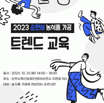 이날 특강은 일방적인 전달 방식의 강의를 벗어나 강사와 교육생이 서로 소통하며 함께 농식품가공 성공 판매 전략을 찾는 시간이 될 예정이며, 가공업체 및 가공에 관심 있는 순천시민이면 누구나 참여가 가능하다.