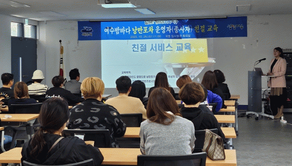 교육은 ㈜썸띵글로벌 이다혜 대표가 ‘글로벌 해양관광도시를 위한 친절교육’이란 주제로 고객 맞이 인사방법 등 고객 접점 서비스 품질 관리에 이어 상황별 친절 서비스와 응대방법 등을 강의했다.