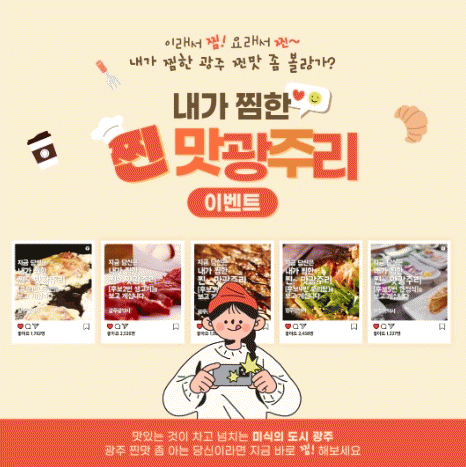광주광역시는 광주 대표 음식을 고르는 ‘내가 찜한 찐~ 맛광주리’ 이벤트를 27일부터 11월 5일까지 10일간 광주시 사회관계망서비스(인스타그램, 블로그, 페이스북)를 통해 진행한다.