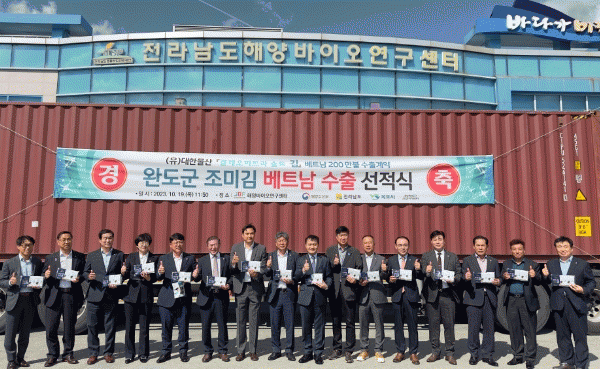 수출 선적식에는 (재)전남바이오산업진흥원 윤호열 원장, 전라남도 신현곤 국제협력관, 전라남도의회 신의준 농수산위원장, 완도군 김현철 부군수, 완도군의회 허궁희 의장 및 군의원, 박희연 해양바이오연구센터장, (유)대한물산 정대한 대표 이사 등이 참석했다.