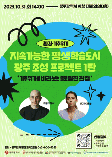 한편 전문가 초청 특강은 ‘지속가능한 평생학습도시 광주 조성 프로젝트’의 하나로 총 3회로 진행된다. 2회차(11월) 방송인 줄리안이 기후환경 개선을 위한 비건을 주제로 강의하고, 3회차(12월)는 박숙현 지속가능발전시스템연구소 소장이 지속가능발전 목표에 대한 이해를 주제로 특강한다.