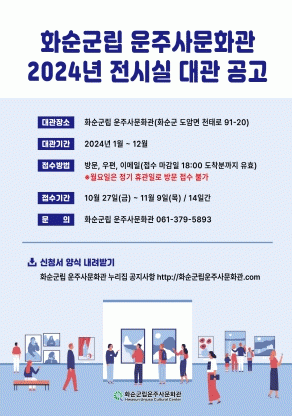 군 관계자는 “운주사문화관은 전시에 최적화된 전시실 구조와 맞춤형 조명 시설로 대관에 대한 만족도가 매우 높은 편”이라며, “관심 있는 개인과 단체는 꼭 지원하길 바란다.”라고 말했다.