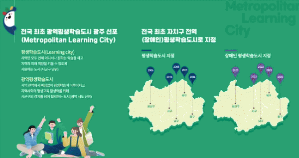 광주시는 전국 최초로 5개구 모두 평생학습도시와 장애인평생학습도시로 선정돼 지난 6월 광역평생학습도시를 선포했다.