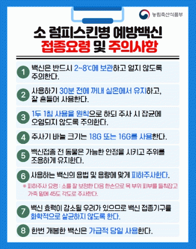 이번 백신은 근육접종을 하는 구제역 백신과 다르게 반드시 피하에 접종해야 하며 백신 제조사에 따라 접종 용량(1~2ml)이 다르므로 동봉된 사용 설명서를 확인한 후 용법 및 용량에 맞게 사용해야 한다. 피하주사는 소를 잘 보정한 다음 한 손으로 목 쪽에 피부를 잡아당겨 피부와 근육 사이에 바늘을 45도 각도로 주사하는 것이다.