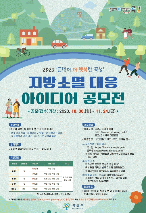 공모전에는 곡성군 지역발전에 관심 있는 사람이라면 누구나 참가할 수 있다. 참가를 원하는 사람은 곡성군청 홈페이지 공고/고시에서 제출 서식을 다운로드하여 작성 후 11월 24일까지 접수하면 된다. 접수 방법은 우편 접수(전라남도 곡성군 곡성읍 군청로 50, 곡성군청 기획실 법무규제팀 제안담당자 앞), 이메일 접수, 국민신문고 제안, 공무원으로 접수하면 된다.