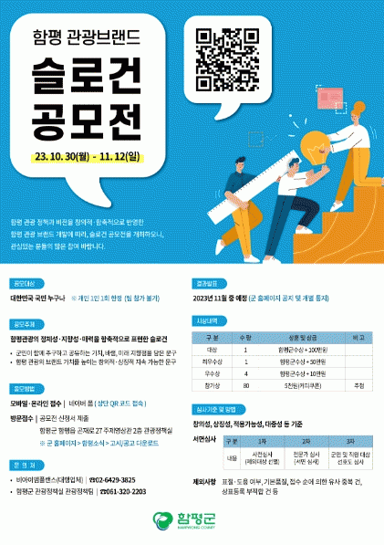 이상익 함평군수는 “함평만의 정체성과 관광비전을 제시하고 전략적 관광 홍보 마케팅에 활용하기 위해 이번 슬로건 공모전을 개최했다”며 “보다 참신하고 다양한 슬로건들이 접수될 수 있도록 많은 분들의 참여 부탁드린다”고 말했다.