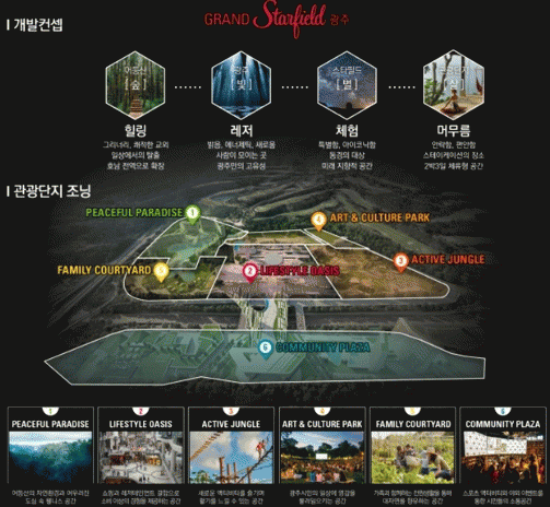 신세계프라퍼티가 제출한 어등산관광단지 개발 콘셉트는 ‘숲·빛·별·삶이 어우러진 대한민국 대표 랜드마크 관광단지 조성’이다. ‘숲&힐링’, ‘빛&여가’, ‘별&체험’, ‘삶&머무름’의 4가지 테마를 설정하고, 유원지 부지 내 6개의 공간 구성을 통해 체류형 복합 관광단지를 완성한다는 구성이다.