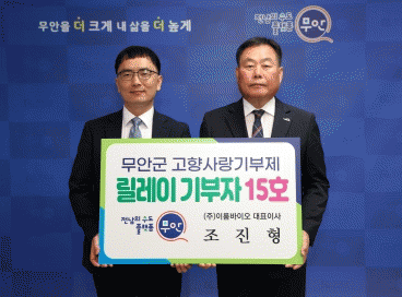 조진형 대표이사는 평소에 아름다운 자연경관과 다채로운 먹거리로 재충전을 위해 자주 찾는 무안군에 따뜻한 마음을 전하고자 직접 무안군청에 방문하여 고향사랑기부제 릴레이 참여 의사를 밝히고 100만 원을 흔쾌히 기탁했다.