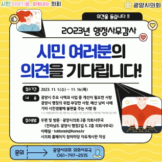 한편, 행정사무감사는 의회가 집행기관에 대해 감사를 진행해 행정의 효율성을 도모하기 위한 것으로, 오는 11월 23일부터 12월 1일까지 9일간 광양시 행정기구와 12개 읍면동, 민간 수탁단체 등을 대상으로 진행될 계획이다.