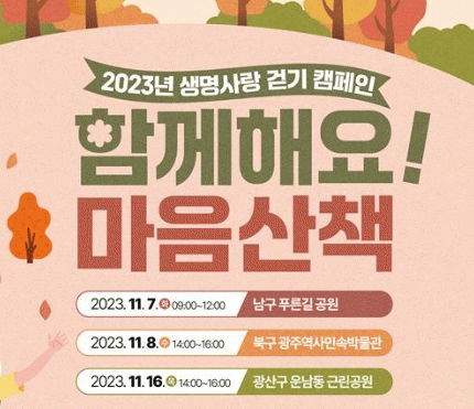 광주시, 광주자살예방센터, 3개 자치구(남구, 북구, 광산구) 정신건강복지센터 공동 주관으로 마련된 이번 행사는 ‘함께해요! 마음산책!’을 주제로 열린다.