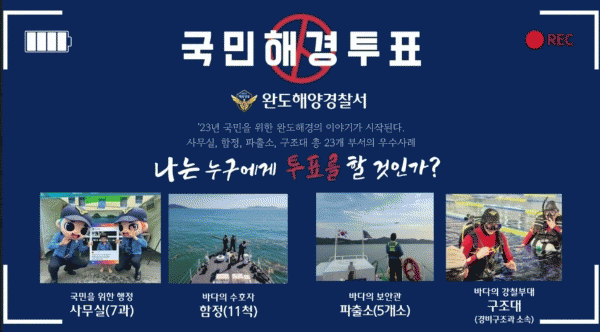 특히 이번 국민해경투표는 ’23년 완도해경서 총 23개 부서 대표 우수사례 (적극행정, 상황대응 등) 선정, 해양경찰의 업무를 알리고 조직 내 국민을 위한 적극적인 행정 및 현장대응을 수행하는 조직문화 조성을 위해 시행됐다.