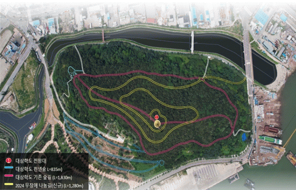 시는 이에 사업비 25억원(기금 15억원, 시비 10억원)을 투입해 삼학교에서 난영공원을 거쳐 정상까지 3.0km에 이르는 삼학도 구간에 ‘무장애 나눔길’을 조성할 계획이다.
