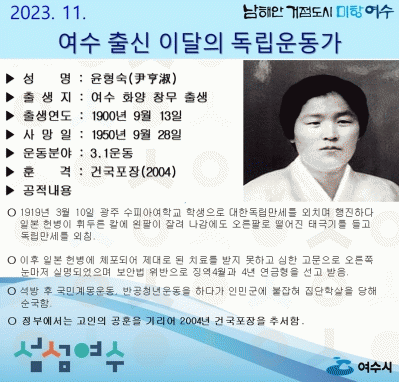 ‘윤형숙(尹亨淑)선생’은 1919년 3월 10일 광주 수피아여학교 학생으로 대한독립만세를 외치며 행진하다 일본 헌병이 휘두른 칼에 왼팔이 잘려 나감에도 오른팔로 떨어진 태극기를 들고 독립만세를 외쳤다.