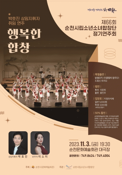 이번 공연은 지난 7월 취임한 박호진 상임지휘자의 취임연주회로, 한국가곡 ‘꽃구름 속에’와 하와이 민요 ‘코에케’ 등의 곡을 색다른 편곡으로 소년소녀합창단만의 톡톡 튀는 멋진 안무와 함께 감상할 수 있다.
