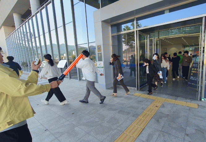 군청 직원을 대상으로 누전에 따른 건물에 정전과 화재가 발생한 상황을 가정해 ▲청사 내 방송을 통한 상황 전파 ▲대피 유도 ▲화재 시 국민행동요령 교육 순으로 진행됐다.