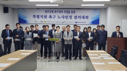 2일(목) 광주광역시의회 1층 시민소통실에서 열린 ‘광주경제 위기지역 지정을 통한 특별지원 촉구 노사민정 결의대회’에서는 대유위니아그룹 계열사 경영 위기로 촉발된 고용위기 해결을 위해 ‘고용위기지역 지정’과 협력업체의 체계적인 지원을 위한 ‘중소기업 특별지원지역’ 및 ‘산업위기대응특별지역’ 지정을 호소했다.