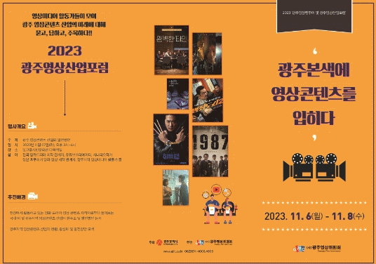 둘째 날에는 ‘2023 광주영상산업포럼’이 7일 오후 2시 빛고을시민문화관 다목적실에서 열린다. 이날 포럼은 고용한 호남대학교 미디어영상공연과 교수의 ‘대한민국 영상산업의 흐름과 방향성’이라는 주제발표에 이어 현장에서 활동하고 있는 전문가들이 모여 종합토론을 벌인다. 이 자리에서는 광주 영상산업의 현주소를 되짚어 보고, 산업적 측면에서의 비즈니스모델 구축과 향후 발전방향을 함께 모색한다.