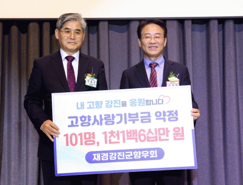 이번 기부 약정은 올해 고향사랑기부제가 시행된 이래, 재경강진군향우회원 101명의 자발적인 동참을 이끌어 낸 결과로 회원들의 의지와 결속력을 다시한 번 확인했다.