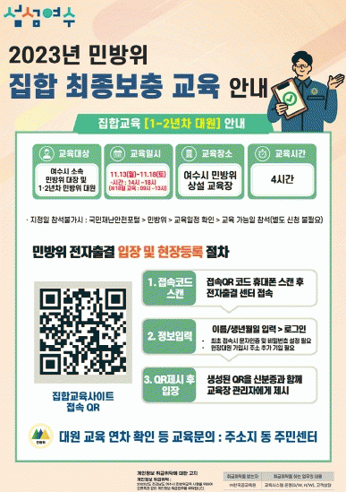 민방위대원의 각 지자체별 교육일정은 국민재난안전포털에서 확인하거나 여수시 안전총괄과 또는 거주지 주민센터로 문의하면 안내받을 수 있다.