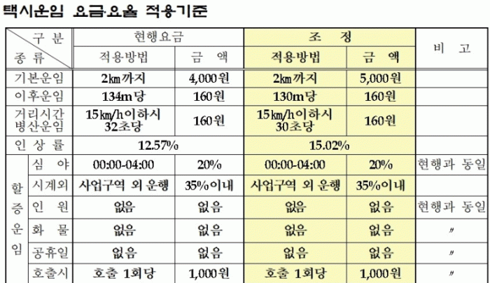 인상 요금 체계에 따르면 중형 택시 기준 기본요금(2km)은 5,000원으로 조정되며 거리요금은 기존 134m당 160원에서 130m당 160원으로, 시간요금은(15km/h이하 주행 시) 32초당 160원에서 30초당 160원으로 조정된다.