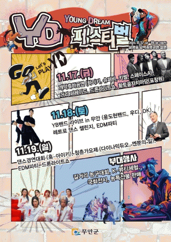 ‘영드림 퍼레이드’는 “모두가 함께하는 행복 무안 어울림 한마당”을 주제로 11월 17일 16시 남악우체국 주차장에서 시작해 ‘남악3로~대죽서로 중앙공원 방면(맥도날드 방향)~대죽서로 김대중광장 방면(오유미당)~주무대’ 구간에서 진행한다.