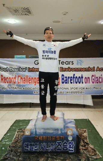 광양 출신으로 광양시 홍보대사로 활동 중인 조승환 씨는 국제환경운동가로 기후 위기의 심각성을 널리 알리기 위해 빙하를 뜻하는 ‘얼음’ 위에서 지구온난화로 고통받고 있는 지구를 표현하는 ‘맨발’로 오래 서 있는 퍼포먼스를 이어가고 있다.
