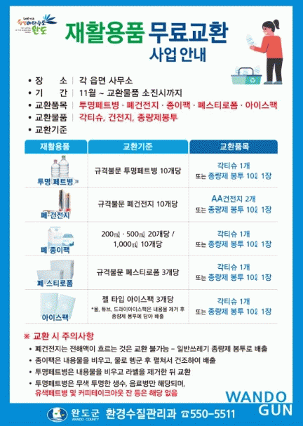 ‘재활용품 무료 교환’은 가정에서 버려지는 재활용품을 가까운 읍면사무소로 가져가면 투명 페트병 10개, 폐 종이 팩 1000㎖ 기준 10개, 폐스티로폼 3개, 아이스팩 3개를 각 티슈나 종량제 봉투로, 폐건전지 10개를 새 건전지 또는 종량제 봉투로 교환해 준다.
