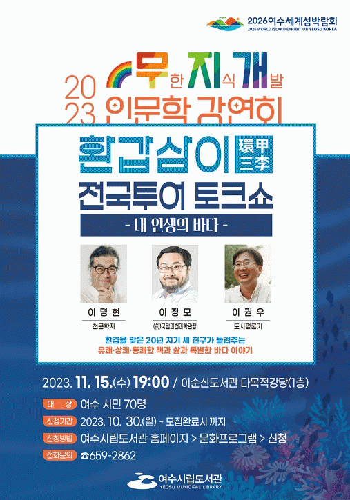 한편, 이번 행사는 여수시가 시민의 인문학적인 역량 강화와 지역 도서관 활성화를 위한 ‘무한지식개발(일명 무지개)’이라는 인문학 강연회의 일환으로 추진된다.