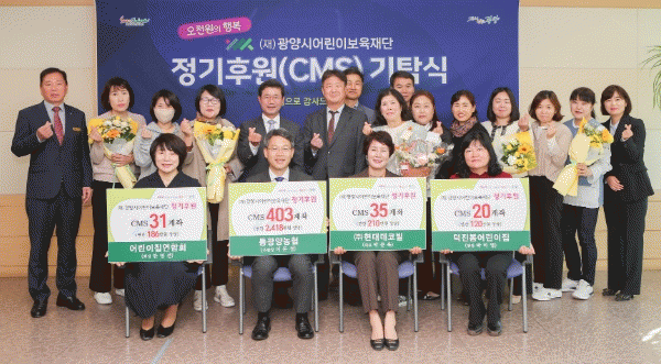 (재)광양시어린이보육재단은 지난 3일 정인화 광양시장, 이광용 재단 이사장, 김희영 재단 상임이사, 기탁자 등 20여 명이 참석한 가운데 정기후원(CMS) 기탁식을 가졌다.