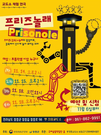 먼저‘극예술창작집단 흥’이 체험형 상황극으로 교도소 톺아보기의 문을 연다. ‘프리즈놀래 PRISONOLE’는 참여자가 수감자로 분해 흥미로운 이야기를 따라 배우와 함께 교도소 전역을 이동하며 퀴즈를 푸는 체험형 프로그램이다. 진행을 맡은 극예술창작집단 흥은 장흥 연극인들로 구성된 연극단체로 그간 지역 소재를 발굴해 창작 및 공연사업을 펼쳐왔다.