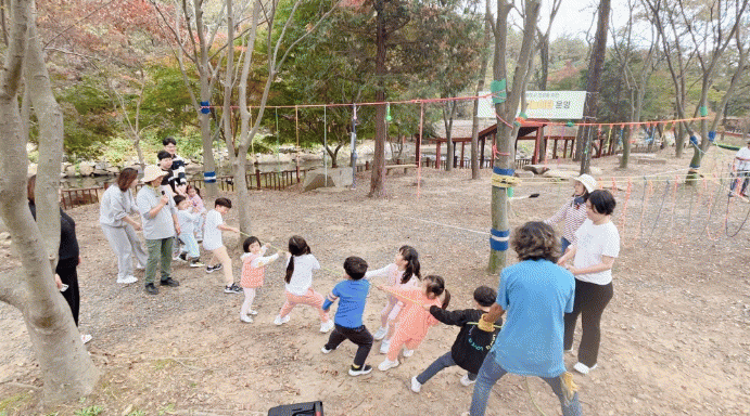 숲밧줄 팝업놀이터에서 아동들은 줄에 매달리고 그 위를 걸으며 순발력과 균형감각을 기르는 것을 물론, 생존매듭법을 익힘으로써 자연스럽게 재난과 재해에 대응할 수 있는 능력도 함양시켰다.