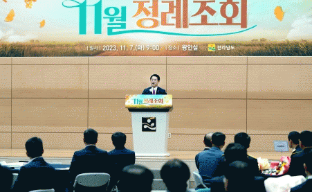 김영록 지사는 이날 오전 도청 왕인실에서 열린 정례조회를 통해 도민 호평을 받으며 성공적으로 치르거나 진행되는 행사 및 성과 등을 일일이 열거하며 “도청 가족의 땀과 눈물, 헌신으로 일해준 성과”라고 치하했다.